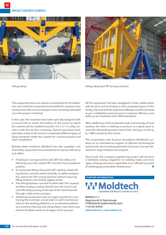 PRECAST CONCRETE ELEMENTS110 CPI %u2013 Concrete Plant International %u2013 6 | 2025 www.cpi-worldwide.comThis equipment does not require civil works/pit for its installation and could be transported and installed to produce near construction sites to save transport costs and easily relocated once the project is finished.In this case, the machines have been specially designed with a curved side to match the bottom of the tunnel on which the culverts will be installed to build a 3.2 x 2.1 m utility corridor under the six-lane motorway. Special provisions have also been made on the mould, to assemble different types of fixing elements inside the culverts for communications and other installations. Besides these machines, Moldtech has also supplied a set of ancillary equipment and accessories to improve efficiency and safety:%u2022 A hydraulic turning machine with 30T that safely and efficiently turns the culverts 90%u00ba into their final installation position.%u2022 An automatic lifting clamp with 30T capacity, allows lifting the box culverts casted vertically, to safely transport the units to the 90%u00ba turning machine without requiring lifting anchors and voiding rigging works. %u2022 Two tilting/laydown concrete buckets with 3m%u00b3 capacity facilitate casting, loading directly from the mixer truck and efficiently pouring at the top of the machines with through a side screw conveyor. %u2022 Additional accessories such as support guides for positioning the machines, access stairs in each machine position to the working platforms, or an elevated platform as a machine cleaning and oiling station, have been supplied to facilitate works at all stages of the process.All this equipment has been designed in close collaboration with Acciona and according to their proposed layout of the facility, planned with the required walkways and fenced areas as per a stablished work process to maximize efficiency and safety as per Australian strict WHS standards.After satisfactory initial production tests and training of local workers, the client is starting to produce at a great pace to meet the demanding project lead times, having to build up to 1,400 culverts for the tunnel.This cooperation with Acciona strengthens Moldtech%u2019s position as an international supplier of efficient technological solutions for the increasing demand of precast concrete elements for large infrastructure projects. Once built, this complex engineering project will become a landmark, easing congestion on existing roads, and once again, showing Acciona%u2019s capabilities as an efficient provider of challenging sustainable infrastructure. nFURTHER INFORMATIONMoldtech S.L. C. Polysol Uno 40, P.I. Piedra Hincada 41500 Alcal%u00e1 de Guadaira (Sevilla), Spain T +34 955 444190 info@moldtechsl.es, www.moldtechsl.esLifting clamp Lifting clamp and 90%u00ba turning machine