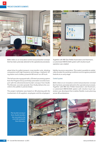 PRECAST CONCRETE ELEMENTS118 CPI %u2013 Concrete Plant International %u2013 6 | 2025 www.cpi-worldwide.comwheel drive for pallet transport, cross transfer units, vibrating compactors with high-frequency technology, a hydraulic tilting station and a battery-powered 40-tonne run-off truck.The hall was also equipped with a 3D steel processing system from the Progress Group and fully automated concrete transport with the aforementioned bucket conveyor from Dudik. The Elematic concrete spreader then finally delivers the concrete to the pallets in precise doses.The project realisation was based on 3D planning with the involvement of all suppliers, employees and the employers' liability insurance association. This made it possible to realistically simulate the working conditions and recognise potential hazards at an early stage.Control systemBefer relies on an innovative control and production concept that has been precisely tailored to the operational processes. Together with RIB One Prefab Automation and Avermann, a customised HMI/SCADA system with intuitive touch operation was developed that enables flexible route planning across 28 workstations.Befer relies on an innovative control and production concept that has been precisely tailored to the operational processes. Together with RIB One Prefab Automation and Avermann, a customised HMI/SCADA system with intuitive touch operation was created.The bucket conveyor from Dudik transfers the concrete to the concrete spreader from Elematic.