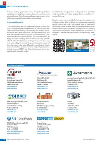 PRECAST CONCRETE ELEMENTS120 CPI %u2013 Concrete Plant International %u2013 6 | 2025 www.cpi-worldwide.comFURTHER INFORMATIONBEFER GmbHIn den Langen St%u00fccken 1038820 Halberstadt, GermanyT +49 3941 672441info@tat-befer.dewww.tat-befer.deWiggert & Co. GmbH Wachhausstr. 3b76227 Karlsruhe, Germany T +49 721 943460 info@wiggert.com www.wiggert.comAvermann Betonfertigteiltechnik GmbH & Co. KG Lengericher Landstr. 3549078 Osnabr%u00fcck, Germany T +49 5405 5050 info@avermann.de www.avermann.deBibko Recycling Technologies GmbH Steinbeisstra%u00dfe 1+2 71717 Beilstein, Germany T +49 7062 92640 info@bibko.com www.bibko.comDUDIK InternationalMackstr. 2188348 Bad Saulgau, GermanyT +49 7581 8877dudik@t-online.dewww.dudik.deElematic Airolantie 2 37801 Akaa, Finland T +358 3 549511info@elematic.comwww.elematic.comRIB SAA Software Engineering GmbH Gudrunstr. 184/31100 Wien, Austria T+43 1 641 42470 office.aut@rib-software.com www.rib-software.comProgress Group Julius-Durst-Stra%u00dfe 100 39042 Brixen, Italy T +39 0472 979 900 info@progress.group www.progress.groupReport videoThe new routing system based on a 4%u00d77 pallet grid allows variable processing times, reduces downtimes and increases plant utilisation. This allows manufacturing processes to be efficiently controlled on a product-specific basis.A successful project\the companies Wiggert and Avermann as the main suppliers of the system technology, worked very well and the implementation was carried out to our complete satisfaction, also with the active support of our own production team,\Volker Weidemann with satisfaction. The workstations are all freely accessible and the pallets can be moved independently of each other. The bottleneck of the previous production was thus successfully eliminated. However, the special feature of the new system is the gained flexibility regarding the height and volume of the precast elements. \already at around 80%,\satisfied with the order intake.In addition, the reorganisation of the production areas has made it possible to reduce walking distances and thus increase efficiency.With the recent investment, Befer is very well positioned for the future to be able to deliver the appropriate solutions quickly, reliably and in very high quality, even for particularly demanding projects. Befer does not see its strength in mass products with highly competitive market prices, but rather in customised components. Volker Weidemann summarises it as follows: \cations.\nRECYCLING TECHNOLOGIES