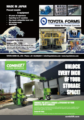 MADE IN JAPANPrecast moulds & equipment- 60 years of experience- Exporting to 27 countries- One-touch collapsible inner core - All custom-made- Watertight TOYOTA KOHKI CO., LTD. | Phone: +81 42(366)6011 | info@toyotaforms.com | www.toyotaforms.comDistributor in the USA:Iskco CO., LTD9627 Rowlet Dr. N Little Rock | AR 72113 | USAToll-Free 1 800 227 6041 | Fax: +1 501 812 0770vibration@iskco.com | www.iskco.com2502_toyota_us.indd 1 15.02.25 17:1825ENHANCE THE SAFETY, STORAGE & EFFICIENCY OF YOUR LOGISTICS WITH COMBILIFTCombilift%u2019s range of multidirectional forklifts, pedestrian reach trucks, straddle carriers and container loaders will allow you to maximize the capacity, improve efficiency and enhance the safety of your facility.Contact Us TodayTo find out how Combilift can help you unlock every inch of your storage space.UNLOCK EVERY INCH OF YOUR STORAGE SPACE!combilift.com