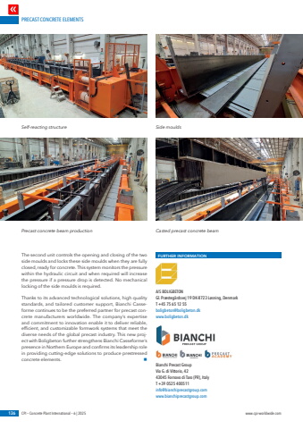 PRECAST CONCRETE ELEMENTS136 CPI %u2013 Concrete Plant International %u2013 6 | 2025 www.cpi-worldwide.comThe second unit controls the opening and closing of the two side moulds and locks these side moulds when they are fully closed, ready for concrete. This system monitors the pressure within the hydraulic circuit and when required will increase the pressure if a pressure drop is detected. No mechanical locking of the side moulds is required. Thanks to its advanced technological solutions, high quality standards, and tailored customer support, Bianchi Casseforme continues to be the preferred partner for precast concrete manufacturers worldwide. The company%u2019s expertise and commitment to innovation enable it to deliver reliable, efficient, and customizable formwork systems that meet the diverse needs of the global precast industry. This new project with Boligbeton further strengthens Bianchi Casseforme%u2019s presence in Northern Europe and confirms its leadership role in providing cutting-edge solutions to produce prestressed concrete elements. nFURTHER INFORMATIONA/S BOLIGBETON Gl. Pr%u00e6steg%u00e5rdsvej 19 DK-8723 L%u00f8sning, DenmarkT +45 75 65 12 55boligbeton@boligbeton.dkwww.boligbeton.dkBianchi Precast Group Via G. di Vittorio, 42 43045 Fornovo di Taro (PR), ItalyT +39 0525 400511 info@bianchiprecastgroup.com www.bianchiprecastgroup.com Self-reacting structurePrecast concrete beam productionSide mouldsCasted precast concrete beam