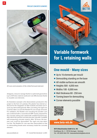 PRECAST CONCRETE ELEMENTSwww.cpi-worldwide.com CPI %u2013 Concrete Plant International %u2013 6 | 2025designers, resource savings thanks to optimised geometries (up to 30 % less material used) and cost-effectiveness thanks to reusable core elements.An illustrative example is the demonstrator produced in the project in the form of a planter. The planter has internal undercuts for the integration of LED modules and does not require any demoulding bevels. After concreting, the rigid core could be taken out and the flexible PU core simply removed.For validation, the flexible core including the wooden core was combined with a conventional GRP mould, prepared for the concrete casting and coated with suitable formwork wax, after which the precast concrete part was cast with a suitable self-compacting concrete mixture. After 18 hours, the twopart core could be demoulded. The rigid core was taken out first. The flexible PU core was then demoulded so that no demoulding bevels were necessary inside the concrete element.3D scan and evaluation of the milled formwork elementBETA Maschinenbau GmbH & Co. KGNordh%u00e4user Str. 2 %u2022 99765 Heringen %u2022 GermanyTel. +49 36333 666-190 %u2022 betonwerktechnik@beta-mb.deVariable formwork for L retaining wallsUp to 16 elements per mouldDemoulding standing on the baseAll visible surfaces are smoothHeights 500 - 4,050 mmWidths 100 - 8,000 mmWall thickness 80 - 250 mmTurning beam for demouldingCorner elements possibleOne mould - Many sizeswww.beta-mb.de