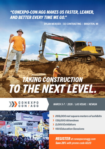 MARCH 3-7 / 2026 / LAS VEGAS / NEVADAREGISTERat conexpoconagg.com Save 20% with promo code AD20269,000 net square meters of exhibits 139,000 Attendees 2,000 Exhibitors 150 Education SessionsTAKING CONSTRUCTIONTO THE NEXT LEVEL.%u201cCONEXPO-CON/AGG MAKES US FASTER, LEANER, AND BETTER EVERY TIME WE GO.%u201dDYLAN MERCIER | D2 CONTRACTING | BRIGHTON, MI