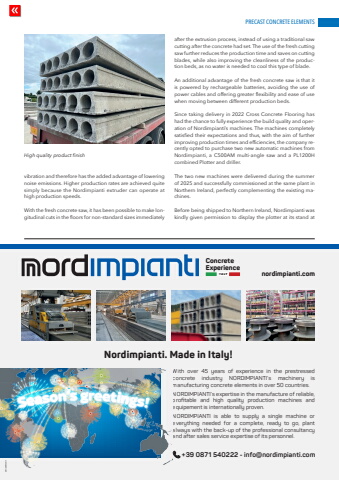 PRECAST CONCRETE ELEMENTSwww.cpi-worldwide.com CPI %u2013 Concrete Plant International %u2013 6 | 2025 153vibration and therefore has the added advantage of lowering noise emissions. Higher production rates are achieved quite simply because the Nordimpianti extruder can operate at high production speeds.With the fresh concrete saw, it has been possible to make longitudinal cuts in the floors for non-standard sizes immediately after the extrusion process, instead of using a traditional saw cutting after the concrete had set. The use of the fresh cutting saw further reduces the production time and saves on cutting blades, while also improving the cleanliness of the production beds, as no water is needed to cool this type of blade.An additional advantage of the fresh concrete saw is that it is powered by rechargeable batteries, avoiding the use of power cables and offering greater flexibility and ease of use when moving between different production beds. Since taking delivery in 2022 Cross Concrete Flooring has had the chance to fully experience the build quality and operation of Nordimpianti%u2019s machines. The machines completely satisfied their expectations and thus, with the aim of further improving production times and efficiencies, the company recently opted to purchase two new automatic machines from Nordimpianti, a C500AM multi-angle saw and a PL1200H combined Plotter and driller.The two new machines were delivered during the summer of 2025 and successfully commissioned at the same plant in Northern Ireland, perfectly complementing the existing machines.Before being shipped to Northern Ireland, Nordimpianti was kindly given permission to display the plotter at its stand at High quality product finishWith over 45 years of experience in the prestressed concrete industry NORDIMPIANTI%u2019s machinery is manufacturing concrete elements in over 50 countries.NORDIMPIANTI%u2019s expertise in the manufacture of reliable, profitable and high quality production machines and equipement is internationally proven.NORDIMPIANTI is able to supply a single machine or everything needed for a complete, ready to go, plant always with the back-up of the professional consultancy and after sales service expertise of its personnel.adv | webnue.itConcreteExperience ITA LY nordimpianti.comNordimpianti. Made in Italy!%ue138+39 0871 540222 - info@nordimpianti.com