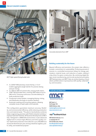 PRECAST CONCRETE ELEMENTS164 CPI %u2013 Concrete Plant International %u2013 6 | 2025 www.cpi-worldwide.com%u2022 2 x 2250/1500 planetary mixers fed by a 1.5 m%u00b3 mobile aggregate weigh batcher for precise dosing and pre-mixing.%u2022 3 x 100-ton (80 m%u00b3) cement silos, serving both mixers.%u2022 2 MCT flying bucket lines, covering 350 meters at up to 240 m/min, ensuring continuous concrete delivery to both production bays.%u2022 Compumat control system, managing dosing, mixing, and distribution through an intuitive interface.%u2022 Automatic washing and recycling systems, allowing complete reuse of wash water and materials.This configuration guarantees maximum accuracy, flexibility, and environmental efficiency, while reducing production time and material waste. %u201cThe plant in Suchedni%u00f3w combines Italian engineering precision with Polish industrial ambition,%u201d explains Gabriele Falchetti, VP Business Development at MCT Italy. %u201cDesigned in a BIM/CAD environment, it uses advanced digital tools to ensure high efficiency and strict quality control. Optimized production lines allow for up to 250,000 tons of precast elements per year, serving industrial, logistics, public utility, and residential projects.%u201dBuilding sustainably for the futureBeyond efficiency and precision, the project also reflects a broader commitment to sustainability. Producing precast elements in a controlled environment allows for energy optimization, material reuse, and reduction of waste, making it a key driver for green construction. By combining digital design, smart manufacturing, and circular production principles, ARP Budownictwo and MCT Italy are jointly shaping a future where prefabrication is synonymous with quality, sustainability, and innovation. nFURTHER INFORMATIONMCT Italy S.r.l.Via Perugia 10506084 Bettona, Italymarketing@marcantonini.comwww.marcantonini.com ARP Budownictwo Sp. z o.o.ul. %u015awi%u0119tojerska 5/700-236 Warszawa, Polandbiuro@arpbudownictwo.plwww.arpbudownictwo.plMCT High speed flying bucket railsConcrete elements from ARP