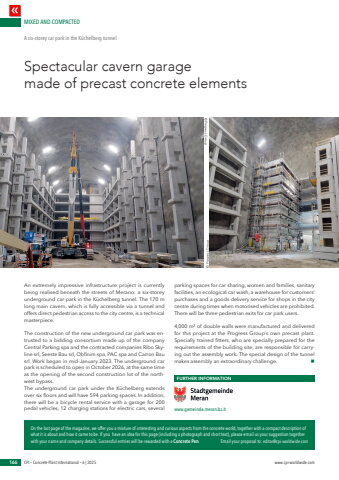 MIXED AND COMPACTEDCPI %u2013 Concrete Plant International %u2013 6 | 2025 www.cpi-worldwide.comOn the last page of the magazine, we offer you a mixture of interesting and curious aspects from the concrete world, together with a compact description of what it is about and how it came to be. If you have an idea for this page (including a photograph and short text), please email us your suggestion together with your name and company details. Successful entries will be rewarded with a Concrete Pen. Email your proposal to: editor@cpi-worldwide.com166Spectacular cavern garage made of precast concrete elementsA six-storey car park in the K%u00fcchelberg tunnelAn extremely impressive infrastructure project is currently being realised beneath the streets of Merano: a six-storey underground car park in the K%u00fcchelberg tunnel. The 170 m long main cavern, which is fully accessible via a tunnel and offers direct pedestrian access to the city centre, is a technical masterpiece.The construction of the new underground car park was entrusted to a bidding consortium made up of the company Central Parking spa and the contracted companies Ribo Skyline srl, Seeste Bau srl, Obfinim spa, PAC spa and Carron Bau srl. Work began in mid-January 2023. The underground car park is scheduled to open in October 2026, at the same time as the opening of the second construction lot of the northwest bypass. The underground car park under the K%u00fcchelberg extends over six floors and will have 594 parking spaces. In addition, there will be a bicycle rental service with a garage for 200 pedal vehicles, 12 charging stations for electric cars, several parking spaces for car sharing, women and families, sanitary facilities, an ecological car wash, a warehouse for customers%u2018 purchases and a goods delivery service for shops in the city centre during times when motorised vehicles are prohibited. There will be three pedestrian exits for car park users.4,000 m%u00b2 of double walls were manufactured and delivered for this project at the Progress Group%u2018s own precast plant. Specially trained fitters, who are specially prepared for the requirements of the building site, are responsible for carrying out the assembly work. The special design of the tunnel makes assembly an extraordinary challenge. nFURTHER INFORMATIONwww.gemeinde.meran.bz.it %u00a9 Progress Group %u00a9 Progress Group