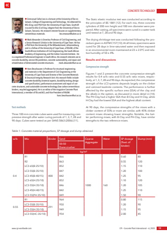 CONCRETE TECHNOLOGYwww.cpi-worldwide.com CPI %u2013 Concrete Plant International %u2013 6 | 2025 19Test methodsThree 100-mm concrete cubes were used for measuring compressive strength after water curing periods of 1, 3, 7, 28 and 90 days. Cubes were tested as per SANS 5863 (2006) [11]. The Static elastic modulus test was conducted according to the principles of BS 1881 [12]. For each mix, three concrete cylinders of 200 mm height and 100 mm diameter were prepared. After casting, all specimens were cured in a water tank until tested at 7, 28 and 90 days. The drying shrinkage test was conducted following the procedure given in ASTM C157 [13]. At all times, specimens were cured for 28 days in lime-saturated water and then exposed in an environmental room maintained at 23 %u00b1 2.0%u00b0C and relative humidity of 50 %u00b1 4%. Results and discussions Compressive strength Figures 1 and 2 present the concrete compressive strength results for 0.4 w/b ratio and 0.55 w/b ratio mixes, respectively, at 1, 3, 7, 28 and 90 days. As expected, the compressive strength of the LC3 systems depends largely on the clinker and calcined kaolinite contents. The performance is further affected by the specific surface area (SSA) of the clay and the alkalis in the system, as discussed in more detail in [14]. The PH-Clay had a higher SSA than B-Clay and H-Clay, while H-Clay had the lowest SSA and the highest alkali content.At 90 days, the compressive strengths of the mixes with a clinker content of 55% or more are similar, with 45% clinker content mixes showing lower strengths. Notable, the better performing mixes, with B-Clay and PH-Clay, have similar strengths to the two reference mixes. n Emmanuel Safari Leo is a lecturer at the University of Dar es Salaam, College of Engineering and Technology. He obtained his MSc (Eng.) and PhD from the University of Cape Town, South Africa and his BSc (Civil Eng.) degree from the University of Dar es Salaam, Tanzania. His research interest focuses on supplementary cementitious materials. leo.emanuel@udsm.ac.tz n Mark Alexander is Emeritus Professor of Civil Engineering, and a Senior Research Scholar in the University of Cape Town. He has a PhD from the University of the Witwatersrand, Johannesburg, and is a Fellow of the University of Cape Town, of RILEM, of the South African Institution of Civil Engineering, the South African Academy of Engineering, and the Indian Concrete Institute. He is a registered Professional Engineer in South Africa. His research interests are in concrete durability, service life prediction, concrete sustainability, and repair and rehabilitation of deteriorated concrete structures. mark.alexander@uct.ac.zan Hans Beushausen is Professor for structural engineering and materials in the Department of Civil Engineering at the University of Cape Town and Director of the Concrete Materials & Structural Integrity Research Unit. His research fields include concrete durability (material aspects, durability testing, design and specification), performance assessment and repair of concrete structures, and sustainable concrete technology (low carbon cementitious binders, recycled aggregates). He is an editor of the magazine Concrete Plant International, a member of fib and ACI, and Vice President of RILEM.hans.beushausen@uct.ac.zaTable 1: Concrete material proportions, SP dosage and slump obtained.w/b Mix Binder Sand Coarse AggregateWater SP dosage(%wt. of binder)Slump (mm)50:50Dune:crusherkg/m%u00b30.4R14008661000 1600.60 80R2 863 0.55 120LC3-65(B:25/10) 852 1.15 110LC3-55(B:35/10) 847 1.20 100LC3-45(B:40/15) 842 1.25 95LC3-65(H:25/10) 852 1.10 120LC3-55(H:35/10) 846 1.20 105LC3-45(H:40/15) 842 1.25 110LC3-55(PH:35/10) 849 1.50 900.55R1291964 0.80 115LC3-55(B:35/10) 950 1.20 90LC3-55(H:35/10) 949 1.15 95LC3-55(HC:35/10) 954 2.00 45
