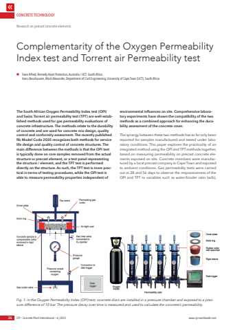 CONCRETE TECHNOLOGY26 CPI %u2013 Concrete Plant International %u2013 6 | 2025 www.cpi-worldwide.comThe South African Oxygen Permeability Index test (OPI) and Swiss Torrent air permeability test (TPT) are well-established methods used for gas permeability evaluations of concrete infrastructure. The methods relate to the durability of concrete and are used for concrete mix design, quality control and conformity assessment. The recently published fib Model Code 2020 recognizes both methods for service life design and quality control of concrete structures. The main difference between the methods is that the OPI test is typically done on core samples removed from the actual structure or precast element, or a test panel representing the structure / element, and the TPT test is performed directly on the structure. As such, the TPT test is more practical in terms of testing procedures, while the OPI test is able to measure permeability properties independent of environmental influences on site. Comprehensive laboratory experiments have shown the compatibility of the two methods as a combined approach for enhancing the durability assessment of the concrete cover. The synergy between these two methods has so far only been reported for samples manufactured and tested under laboratory conditions. This paper explores the practicality of an integrated method using the OPI and TPT methods together, based on measuring permeability on precast concrete elements exposed on site. Concrete members were manufactured by a local precast company in Cape Town and exposed to ambient conditions. Gas permeability tests were carried out at 28 and 56 days to observe the responsiveness of the OPI and TPT to variables such as water/binder ratio (w/b), Complementarity of the Oxygen Permeability Index test and Torrent air Permeability testResearch on precast concrete elementsn Sean Alfred, Remedy Asset Protection, Australia / UCT, South AfricaHans Beushausen, Mark Alexander, Department of Civil Engineering, University of Cape Town (UCT), South AfricaFig. 1: In the Oxygen Permeability Index (OPI) test, concrete discs are installed in a pressure chamber and exposed to a pressure difference of 10 bar. The pressure decay over time is measured and used to calculate the concrete%u2019s permeability.
