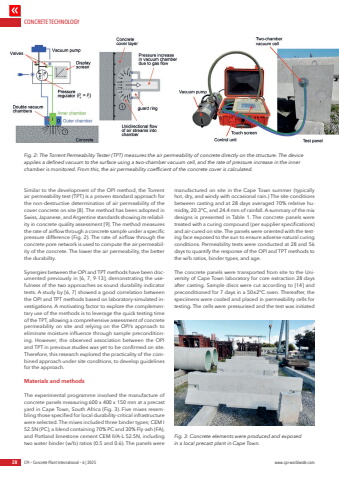 CONCRETE TECHNOLOGY28 CPI %u2013 Concrete Plant International %u2013 6 | 2025 www.cpi-worldwide.comSimilar to the development of the OPI method, the Torrent air permeability test (TPT) is a proven standard approach for the non-destructive determination of air permeability of the cover concrete on site [8]. The method has been adopted in Swiss, Japanese, and Argentine standards showing its reliability in concrete quality assessment [9]. The method measures the rate of airflow through a concrete sample under a specific pressure difference (Fig. 2). The rate of airflow through the concrete pore network is used to compute the air permeability of the concrete. The lower the air permeability, the better the durability.Synergies between the OPI and TPT methods have been documented previously in [6, 7, 9-13], demonstrating the usefulness of the two approaches as sound durability indicator tests. A study by [6, 7] showed a good correlation between the OPI and TPT methods based on laboratory-simulated investigations. A motivating factor to explore the complementary use of the methods is to leverage the quick testing time of the TPT, allowing a comprehensive assessment of concrete permeability on site and relying on the OPI%u2019s approach to eliminate moisture influence through sample preconditioning. However, the observed association between the OPI and TPT in previous studies was yet to be confirmed on site. Therefore, this research explored the practicality of the combined approach under site conditions, to develop guidelines for the approach.Materials and methodsThe experimental programme involved the manufacture of concrete panels measuring 600 x 400 x 150 mm at a precast yard in Cape Town, South Africa (Fig. 3). Five mixes resembling those specified for local durability-critical infrastructure were selected. The mixes included three binder types; CEM I 52.5N (PC), a blend containing 70% PC and 30% Fly-ash (FA), and Portland limestone cement CEM II/A-L 52.5N, including two water binder (w/b) ratios (0.5 and 0.6). The panels were manufactured on site in the Cape Town summer (typically hot, dry, and windy with occasional rain.) The site conditions between casting and at 28 days averaged 70% relative humidity, 20.3%u00b0C, and 24.4 mm of rainfall. A summary of the mix designs is presented in Table 1. The concrete panels were treated with a curing compound (per supplier specifications) and air-cured on site. The panels were oriented with the testing face exposed to the sun to ensure adverse natural curing conditions. Permeability tests were conducted at 28 and 56 days to quantify the response of the OPI and TPT methods to the w/b ratios, binder types, and age.The concrete panels were transported from site to the University of Cape Town laboratory for core extraction 28 days after casting. Sample discs were cut according to [14] and preconditioned for 7 days in a 50%u00b12%u00b0C oven. Thereafter, the specimens were cooled and placed in permeability cells for testing. The cells were pressurised and the test was initiated Fig. 2: The Torrent Permeability Tester (TPT) measures the air permeability of concrete directly on the structure. The device applies a defined vacuum to the surface using a two-chamber vacuum cell, and the rate of pressure increase in the inner chamber is monitored. From this, the air permeability coefficient of the concrete cover is calculated.Fig. 3: Concrete elements were produced and exposed in a local precast plant in Cape Town.