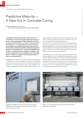 CONCRETE TECHNOLOGY34 CPI %u2013 Concrete Plant International %u2013 6 | 2025 www.cpi-worldwide.comFor decades, Kraft Curing has been at the forefront of innovation in concrete curing. The introduction of new cements - using various types of fillers (hydraulic and inert) to replace Portland clinker (in an effort to reduce cement%u2019s CO2 footprint) - is causing producers of precast and prestress elements to question when these products can be demoulded or detensioned without risking damage to the product. To address this issue - as well as the general issue of when a concrete product is suitable for handling - Kraft Curing%u2019s introduction, last year, of Match-Cure technology marks a milestone in quality control for precast and prestress concrete production. Designed as a comprehensive early-strength monitoring system, Match-Cure allows producers of precast and prestress concrete elements to ensure that the freshly poured element achieves the required strength prior to demoulding or tensioning - enabling the earliest possible detensioning or demoulding time, reducing energy and unnecessary labor costs while maintaining safety and product quality that may be a result of inadequate strength development.Test cylinders or cubes, produced as test specimen when a precast or prestress element is poured, are placed into an insulated Match-Cure environmental chamber that allows for precise measurement and control of the test specimen temperature based on (precisely duplicating) the internal temperature of the actual concrete element.As the produced concrete element gains temperature (either though hydration or an accelerated curing system) a heating unit inside the Match-Cure enclosure heats the specimen while an exhaust unit cools (to a minimum of the ambient temperature) the temperature of the specimen if the temperature of the concrete element drops (perhaps due to wind, a failed curing cover, etc.). A cooling system is available as an option for regions which experience harsh winters. Predictive Maturity %u2013 A New Era in Concrete CuringKraft Curing Systems GmbH, 49699 Lindern, Germany n Bertrand Delforge, JB Concrete, FranceApril Kraft, Kraft Curing Systems, Kraft Curing Systems GmbH, GermanyIntegration of Match-Cure into Kraft Curing%u2019s AutoCure ecosystem to prevent duplicate control and montoring systems and save money. Match-Cure environmental chambers for a total of five (5) production areas/beds/