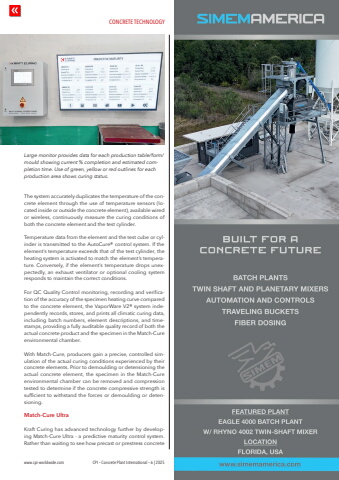CONCRETE TECHNOLOGYwww.cpi-worldwide.com CPI %u2013 Concrete Plant International %u2013 6 | 2025The system accurately duplicates the temperature of the concrete element through the use of temperature sensors (located inside or outside the concrete element), available wired or wireless, continuously measure the curing conditions of both the concrete element and the test cylinder.Temperature data from the element and the test cube or cylinder is transmitted to the AutoCure%u00ae control system. If the element%u2019s temperature exceeds that of the test cylinder, the heating system is activated to match the element%u2019s temperature. Conversely, if the element%u2019s temperature drops unexpectedly, an exhaust ventilator or optional cooling system responds to maintain the correct conditions. For QC Quality Control monitoring, recording and verification of the accuracy of the specimen heating curve compared to the concrete element, the VaporWare V2%u00ae system independently records, stores, and prints all climatic curing data, including batch numbers, element descriptions, and timestamps, providing a fully auditable quality record of both the actual concrete product and the specimen in the Match-Cure environmental chamber. With Match-Cure, producers gain a precise, controlled simulation of the actual curing conditions experienced by their concrete elements. Prior to demoulding or detensioning the actual concrete element, the specimen in the Match-Cure environmental chamber can be removed and compression tested to determine if the concrete compressive strength is sufficient to withstand the forces or demoulding or detensioning. Match-Cure Ultra Kraft Curing has advanced technology further by developing Match-Cure Ultra - a predictive maturity control system. Rather than waiting to see how precast or prestress concrete Large monitor provides data for each production table/form/mould showing current % completion and estimated completion time. Use of green, yellow or red outlines for each production area shows curing status.