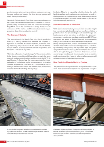 CONCRETE TECHNOLOGY36 CPI %u2013 Concrete Plant International %u2013 6 | 2025 www.cpi-worldwide.comperforms under given curing conditions, producers can now forecast and control exactly the time when a product will reach the required strength.With Kraft Curing%u2019s Match-Cure Ultra, concrete producers can set curing parameters (temperature and duration of initial or pre-set, ramp and soak) to meet the compressive strength target that allows the concrete to be safely demoulded or detensioned. This marks a shift from reactive monitoring to proactive, data-driven production control!The Science of MaturityThe foundation of the Match-Cure Ultra lies in predictive maturity, a testing method that assesses the progress of hydration in concrete. As cement hydrates, it releases heat. By measuring temperature inside the element with thermocouple sensors, maturity quantifies the rate of hydration and translates it into a maturity index.This index reflects the \is the time the material would have taken to reach the same strength under standard curing conditions, typically 20%u00b0C. By applying the Arrhenius law, the system accounts for the acceleration of hydration at higher temperatures or its slowing at lower temperatures. The result is a continuous picture of strength development inside the element itself, without the need for destructive testing at every stage.Predictive Maturity is especially valuable during the early hardening phase and requires certain equipment to work, including sensors to capture temperature data, storage devices to log measurements, and dedicated software to process results into strength predictions.From Measurement to PredictionWhile conventional maturity measurement provides insight into current strength, Kraft Curing has transformed it into a predictive tool. The process begins with establishing a calibration curve, where test cubes or cylinders of a given concrete mix are cured under standard conditions at 20%u00b0C. These specimens are tested at defined intervals for compressive strength, and the results create a strength%u2013time profile.During actual production, sensors embedded in the concrete element measure the real temperature (hydration) evolution. By converting curing history into equivalent ages, the system can position the element along the calibration curve and predict its strength at any given moment. This means producers no longer need to wait for destructive tests to confirm readiness. Instead, they know in advance when concrete will achieve the desired mechanical properties.How Predictive Maturity Works in PracticeThe predictive maturity workflow is straightforward but powerful. A set of calibration specimens is prepared using the A heavy-duty magnetic wireless temperature transmitter (gray enclosure) with Type K thermocouple wire for internal concrete temperature measurementA wireless repeater placed throughout a factory or yard to ensure excellent signal strength throughout a large area. thermocouple wire for internal concrete temperature measurement