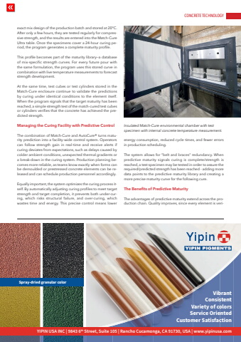CONCRETE TECHNOLOGYwww.cpi-worldwide.com CPI %u2013 Concrete Plant International %u2013 6 | 2025 37exact mix design of the production batch and stored at 20%u00b0C. After only a few hours, they are tested regularly for compressive strength, and the results are entered into the Match-Cure Ultra table. Once the specimens cover a 24-hour curing period, the program generates a complete maturity profile.This profile becomes part of the maturity library%u2014a database of mix-specific strength curves. For every future pour with the same formulation, the program uses this stored curve in combination with live temperature measurements to forecast strength development. At the same time, test cubes or test cylinders stored in the Match-Cure enclosure continue to validate the predictions by curing under identical conditions to the element itself. When the program signals that the target maturity has been reached, a simple strength test of the match-cured test cubes or cylinders verifies that the concrete has achieved the predicted strength.Managing the Curing Facility with Predictive ControlThe combination of Match-Cure and AutoCure%u00ae turns maturity prediction into a facility-wide control system. Operators can follow strength gain in real-time and receive alerts if curing deviates from expectations, such as delays caused by colder ambient conditions, unexpected thermal gradients or a break-down in the curing system. Production planning becomes more reliable, as teams know exactly when forms can be demoulded or prestressed concrete elements can be released and can schedule production personnel accordingly.Equally important, the system optimizes the curing process itself. By automatically adjusting curing profiles to meet target strength and target completion, it prevents both under-curing, which risks structural failure, and over-curing, which wastes time and energy. This precise control means lower energy consumption, reduced cycle times, and fewer errors in production scheduling.The system allows for %u201cbelt and braces%u201d redundancy. When predictive maturity signals curing is complete/strength is reached, a test specimen may be tested in order to assure the required/predicted strength has been reached - adding more data points to the predictive maturity library and creating a more precise maturity curve for the following cure.The Benefits of Predictive MaturityThe advantages of predictive maturity extend across the production chain. Quality improves, since every element is veriInsulated Match-Cure environmental chamber with test specimen with internal concrete temperature measurement. VibrantConsistentVariety of colorsService OrientedCustomer SatisfactionYIPIN USA INC | 9843 6th Street, Suite 105 | Rancho Cucamonga, CA 91730, USA | www.yipinusa.com Spray-dried granular color