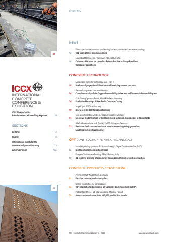 CPI %u2013 Concrete Plant International %u2013 6 | 2025 www.cpi-worldwide.comCONTENTSNEWSFrom a passionate innovator to a leading force of prestressed concrete technology12 100 years of Paul MaschinenfabrikColumbia Machine, Inc., Vancouver, WA 98661, USA16 Columbia Machine, Inc. appoints Robert Gustine as Group President, Vancouver OperationsCONCRETE TECHNOLOGYSustainable concrete technology, LC3 %u2013 Part 118 Mechanical properties of limestone calcined clay cement concrete Research on precast concrete elements26 Complementarity of the Oxygen Permeability Index test and Torrent air Permeability testKraft Curing Systems GmbH, 49699 Lindern, Germany 34 Predictive Maturity %u2013 A New Era in Concrete CuringMapei SpA, 20158 Milan, Italy 40 A new service: EPD for concrete mixesTeka Maschinenbau GmbH, 67480 Edenkoben, Germany 44 Extensive modernisation of the Heidelberg Materials mixing plant in AhrensfeldeIMKO Micromodultechnik GmbH, 76275 Ettlingen, Germany52 Real-time fresh concrete moisture measurement is gaining ground on South Korean construction sitesInstalled printing system at TU Braunschweig%u2019s Digital Construction Site (DSC)56 Multifunctional Construction Robot Progress 3D Concrete Printing, 39042 Brixen, Italy58 3D concrete printing offers entirely new possibilities in precast constructionCONCRETE PRODUCTS / CAST STONEPeri SE, 89264 Wei%u00dfenhorn, Germany 62 Fact check on the production palletOnline registration for visitors open66 13th International Conference on Concrete Block Pavement (ICCBP)Polblat Kopyt Sp. J., 26-640 Skaryszew, Mak%u00f3w, Poland70 Annual output of more than 100,000 production boards5834ICCX T%u00fcrkiye 2026 %u2013 Premiere event with exciting keynotes 10SECTIONSEditorial 3Imprint 8International events for the concrete and precast industry 15Advertiser%u2019s List 165INTERNATIONAL CONCRETECONFERENCE & EXHIBITION