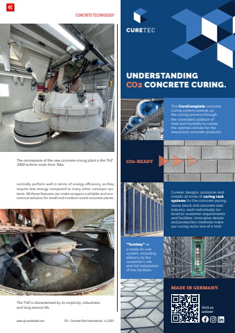 CONCRETE TECHNOLOGYwww.cpi-worldwide.com CPI %u2013 Concrete Plant International %u2013 6 | 2025normally perform well in terms of energy efficiency, as they require less energy compared to many other conveyor systems. All these features can make scrapers a reliable and economical solution for small and medium-sized concrete plants.The centrepiece of the new concrete mixing plant is the THZ 3000 turbine mixer from Teka.The THZ is characterised by its simplicity, robustness and long service life.MADE IN GERMANY.Visit us online! The CureComplete concrete curing system speeds up the curing process through the controlled addition of heat and humidity to create the optimal climate for the respective concrete products.Curetec designs, produces and installs all kinds of curing rack systems for the concrete paving stone, block and concrete slab industry, each individually tailored to customer requirements and facilities. Innovative details and production methods make our curing racks one of a kind.%u201cTurnkey%u201c as a ready-to-use system, including delivery to the customer%u2018s site and full installa tion of the facilities.UNDERSTANDINGCO2 CONCRETE CURING.CO2-READY