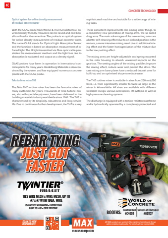 CONCRETE TECHNOLOGYwww.cpi-worldwide.com CPI %u2013 Concrete Plant International %u2013 6 | 2025 49Optical system for online density measurement of residual concrete waterWith the OLAS probe from Werne & Thiel Sensortechnic, environmentally friendly resources can be saved and cost benefits utilised at the same time. The probe is an optical system for online density measurement of residual concrete water. The name OLAS stands for Optical Light Absorption Sensor and the function is based on absorption measurement of infrared light. The IR light transmitted via fibre optic cable penetrates the measurement medium and the light loss due to absorption is evaluated and output as a density signal.OLAS probes have been in operation in international concrete plants for many years. Heidelberg Materials is also convinced by the system and has equipped numerous concrete plants with the OLAS probe.Teka turbine mixer THZThe Teka THZ turbine mixer has been the favourite mixer of many customers for years. Thousands of Teka turbine mixers, also with special equipment, have been delivered to the building materials industry worldwide since 1961. The THZ is characterised by its simplicity, robustness and long service life. Due to continuous further development, the THZ is a very sophisticated machine and suitable for a wide range of mixing tasks.These consistent improvements led, among other things, to a completely new generation of mixing arms, the so-called drag arms. The main advantages of the new mixing arms are a better self-cleaning effect due to an inclined position in the mixture, a more intensive mixing result due to additional mixing effort and the faster homogenisation of the mixture due to the low pushing effect.The mixing arms are height-adjustable and spring-mounted in the rotor housing to absorb unwanted impacts on the gearbox. The setting angles of the mixing paddles improve the mixing effect, reduce wear and protect the drive. The cast mixing arm base plates have a reduced deposit area for build-up and an optimised shape to reduce wear.The THZ turbine mixer is available in sizes from 250 to 6,000 litres, i.e. from significantly smaller to twice as large as the mixer in Ahrensfelde. All sizes are available with different wearable linings, various accessories, lift systems as well as high-pressure cleaning systems.The discharge is equipped with a torsion-resistant cast frame and is hydraulically operated by a completely protected and All MAX products are protected by registered patents and design rights including trademarks. For details, please contact MAX.RB443TTIES WIRE MESH x WIRE MESH, UP TO#7 x #7 WITH 19GA. WIRELOAD ASSIST MECHANISM %u2022 FASTER TYINGBUILT TO LAST %u2022 COST EFFECTIVEREBAR TYINGJUST GOTFASTERSCAN TO VIEWOUR WEBSITECentral Hall BOOTHS: #C4005Silver Lot (Outside)#031137