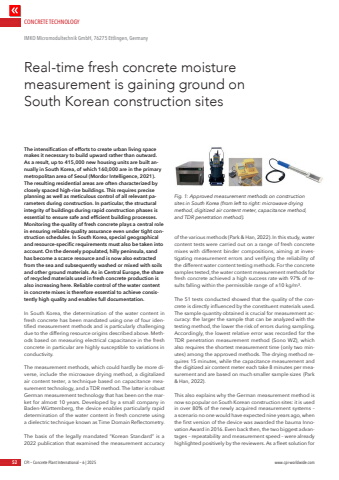 CONCRETE TECHNOLOGY52 CPI %u2013 Concrete Plant International %u2013 6 | 2025 www.cpi-worldwide.comThe intensification of efforts to create urban living space makes it necessary to build upward rather than outward. As a result, up to 415,000 new housing units are built annually in South Korea, of which 160,000 are in the primary metropolitan area of Seoul (Mordor Intelligence, 2021). The resulting residential areas are often characterized by closely spaced high-rise buildings. This requires precise planning as well as meticulous control of all relevant parameters during construction. In particular, the structural integrity of buildings during rapid construction phases is essential to ensure safe and efficient building processes. Monitoring the quality of fresh concrete plays a central role in ensuring reliable quality assurance even under tight construction schedules. In South Korea, special geographical and resource-specific requirements must also be taken into account. On the densely populated, hilly peninsula, sand has become a scarce resource and is now also extracted from the sea and subsequently washed or mixed with soils and other ground materials. As in Central Europe, the share of recycled materials used in fresh concrete production is also increasing here. Reliable control of the water content in concrete mixes is therefore essential to achieve consistently high quality and enables full documentation.In South Korea, the determination of the water content in fresh concrete has been mandated using one of four identified measurement methods and is particularly challenging due to the differing resource origins described above. Methods based on measuring electrical capacitance in the fresh concrete in particular are highly susceptible to variations in conductivity.The measurement methods, which could hardly be more diverse, include the microwave drying method, a digitalized air content tester, a technique based on capacitance measurement technology, and a TDR method. The latter is robust German measurement technology that has been on the market for almost 10 years. Developed by a small company in Baden-W%u00fcrttemberg, the device enables particularly rapid determination of the water content in fresh concrete using a dielectric technique known as Time Domain Reflectometry.The basis of the legally mandated %u201cKorean Standard%u201d is a 2022 publication that examined the measurement accuracy of the various methods (Park & Han, 2022). In this study, water content tests were carried out on a range of fresh concrete mixes with different binder compositions, aiming at investigating measurement errors and verifying the reliability of the different water content testing methods. For the concrete samples tested, the water content measurement methods for fresh concrete achieved a high success rate with 97% of results falling within the permissible range of %u00b110 kg/m%u00b3.The 51 tests conducted showed that the quality of the concrete is directly influenced by the constituent materials used. The sample quantity obtained is crucial for measurement accuracy: the larger the sample that can be analyzed with the testing method, the lower the risk of errors during sampling. Accordingly, the lowest relative error was recorded for the TDR penetration measurement method (Sono WZ), which also requires the shortest measurement time (only two minutes) among the approved methods. The drying method requires 15 minutes, while the capacitance measurement and the digitized air content meter each take 8 minutes per measurement and are based on much smaller sample sizes (Park & Han, 2022).This also explains why the German measurement method is now so popular on South Korean construction sites: it is used in over 80% of the newly acquired measurement systems %u2013 a scenario no one would have expected nine years ago, when the first version of the device was awarded the bauma Innovation Award in 2016. Even back then, the two biggest advantages %u2013 repeatability and measurement speed %u2013 were already highlighted positively by the reviewers. As a fleet solution for Real-time fresh concrete moisture measurement is gaining ground on South Korean construction sitesIMKO Micromodultechnik GmbH, 76275 Ettlingen, GermanyFig. 1: Approved measurement methods on construction sites in South Korea (from left to right: microwave drying method, digitized air content meter, capacitance method, and TDR penetration method).