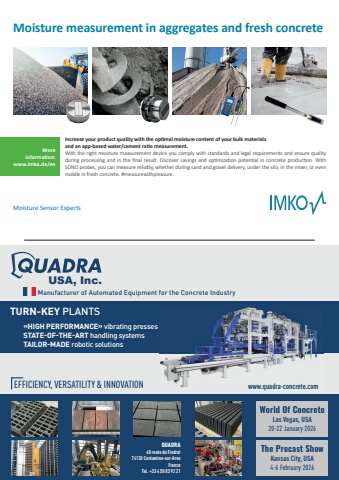 EFFICIENCY, VERSATILITY & INNOVATIONUSA, Inc.Manufacturer of Automated Equipment for the Concrete IndustryTURN-KEY PLANTS%u00abHIGH PERFORMANCE%u00bb vibrating pressesSTATE-OF-THE-ART handling systemsTAILOR-MADE robotic solutionsQUADRA40 route de Findrol 74130 Contamine-sur-Arve France Tel. +33 4 50 03 92 21 www.quadra-concrete.comWorld Of ConcreteLas Vegas, USA20-22 January 2026The Precast ShowKansas City, USA4-6 February 2026Moisture Sensor ExpertsMoisture measurement in aggregates and fresh concreteIncrease your product quality with the optimal moisture content of your bulk materialsand an app-based water/cement ratio measurement.With the right moisture measurement device you comply with standards and legal requirements and ensure quality during processing and in the final result. Discover savings and optimization potential in concrete production. With SONO probes, you can measure reliably, whether during sand and gravel delivery, under the silo, in the mixer, or even mobile in fresh concrete. #measurewithpleasure. More information: www.imko.de/en