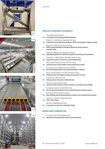 CONTENTSPRECAST CONCRETE ELEMENTSDismantling-friendly construction100 A new approach for attaching prefabricated balconiesMoldtech S.L., 41500 Alcal%u00e1 de Guadaira (Sevilla), Spain108 Complete line for box culverts for the Western Harbour Tunnel project in Sydney, AustraliaWiggert & Co. GmbH, 76227 Karlsruhe, Germany 112 Modern mixing technology for the high-quality precast concrete elements from Befer GmbHOlmet Italy, 31040 Signoressa di Trevignano (TV), Italy122 Expanding the global reach: Machinery and plants for precasting concrete elementsPrensoland S.A., 08592 Sant Mart%u00ed de Centelles, Barcelona, Spain128 Exposed wires system: A silicosis-free, water-friendly solutionAllplan Software Engineering GmbH, 5412 Puch, Austria130 Innovative precast concrete outdoor staircase planned and executedBianchi Precast Group, 43045 Fornovo di Taro (PR), Italy134 New self-reacting production line for prestressed beams in DenmarkWasa Compound GmbH & Co. KG, 98617 Neubrunn, Germany138 Flexible formwork technology for complex precast concrete elementsProgress Group, 39042 Brixen, Italy142 Pioneering Precast Innovation in Western CanadaCBE Group, 37550 Saint Avertin, France 146 Concrete moulds accurate to a tenth of a millimeter, essential for tunnel reliabilityNordimpianti System Srl, 66100 Chieti (CH), Italy152 Two new automatic machines for Cross Concrete Flooring Ltd in Northern IrelandRatec GmbH, 68766 Hockenheim, Germany 156 Glass GmbH Bauunternehmung Modernises Production Line with New Battery Formwork Schnell S.p.a., 61036 Colli al Metauro (PU), Italy160 Faster, safer, stronger MCT Italy srl, 06084 Bettona (PG), Italy 162 A new precast concrete hub in Suchedni%u00f3w, PolandMIXED AND COMPACTEDA six-storey car park in the K%u00fcchelberg tunnel166 Spectacular cavern garage made of precast concrete elementsCPI %u2013 Concrete Plant International %u2013 6 | 2025 www.cpi-worldwide.com100112166152
