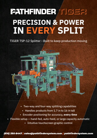 (616) 395-8447 | sales@pathfindersystem.com | pathfindersystem.comPRECISION & POWERTIGER TSP-12 Splitter - Built to keep production movingIN EVERY SPLIT%u2022 Two-way and four-way splitting capabilities%u2022 Handles products from 1.7 in to 16 in tall%u2022 Encoder positioning for accuracy, every time%u2022 Flexible setup %u2014 hand-fed, auto-feed, or large capacity automatic%u2022 Intuitive touchscreen graphic control
