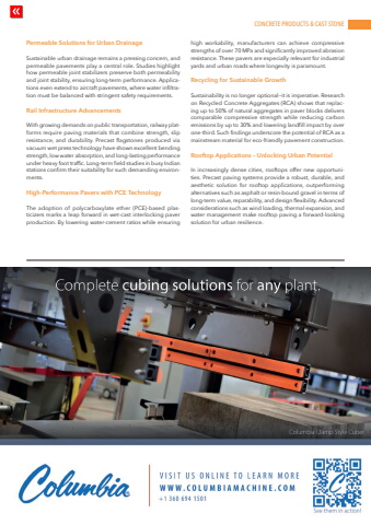 CONCRETE PRODUCTS & CAST STONEwww.cpi-worldwide.com CPI %u2013 Concrete Plant International %u2013 6 | 2025 67Permeable Solutions for Urban DrainageSustainable urban drainage remains a pressing concern, and permeable pavements play a central role. Studies highlight how permeable joint stabilizers preserve both permeability and joint stability, ensuring long-term performance. Applications even extend to aircraft pavements, where water infiltration must be balanced with stringent safety requirements.Rail Infrastructure AdvancementsWith growing demands on public transportation, railway platforms require paving materials that combine strength, slip resistance, and durability. Precast flagstones produced via vacuum wet press technology have shown excellent bending strength, low water absorption, and long-lasting performance under heavy foot traffic. Long-term field studies in busy Indian stations confirm their suitability for such demanding environments.High-Performance Pavers with PCE TechnologyThe adoption of polycarboxylate ether (PCE)-based plasticizers marks a leap forward in wet-cast interlocking paver production. By lowering water-cement ratios while ensuring high workability, manufacturers can achieve compressive strengths of over 70 MPa and significantly improved abrasion resistance. These pavers are especially relevant for industrial yards and urban roads where longevity is paramount.Recycling for Sustainable GrowthSustainability is no longer optional%u2014it is imperative. Research on Recycled Concrete Aggregates (RCA) shows that replacing up to 50% of natural aggregates in paver blocks delivers comparable compressive strength while reducing carbon emissions by up to 30% and lowering landfill impact by over one-third. Such findings underscore the potential of RCA as a mainstream material for eco-friendly pavement construction.Rooftop Applications %u2013 Unlocking Urban PotentialIn increasingly dense cities, rooftops offer new opportunities. Precast paving systems provide a robust, durable, and aesthetic solution for rooftop applications, outperforming alternatives such as asphalt or resin-bound gravel in terms of long-term value, reparability, and design flexibility. Advanced considerations such as wind loading, thermal expansion, and water management make rooftop paving a forward-looking solution for urban resilience.
