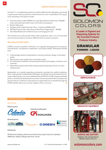 CONCRETE PRODUCTS & CAST STONEwww.cpi-worldwide.com CPI %u2013 Concrete Plant International %u2013 6 | 2025FURTHER INFORMATIONwww.iccbp.orgPlatinum sponsorDiamond sponsorsGold sponsorsKBT Machineries, Bengaluru | Kobra Formen GmbH, Germany | Sagar Cements Ltd., Hyderabad SIMEM India , Vadodara | Palfinger India Pvt Ltd., ChennaiInternational media partnerOn April 11, a complimentary plant tour will be offered to the delegates, presenting a typical paver block production at Earth Pavers Pvt. Ltd. In Hyderabad. The equipment operating in this plant includes%u2022 Columbia (India make) SPM30 Concrete Block Machine Pallet size 750x600 : Fully automated plant with Cuber and Kraft Curing System. %u2022 Besser%u2019s Bescopac%u2022 Parijatha (India make) Hermetic Press - 3 stations (APM316 ED)%u2022 KBT Machinery (India make) Vacuum Wet Press Single Station - WP400%u2022 Shot Blast Machine from Patel Furnace and Forging Pvt. Ltd.This exclusive tour will provide Indian make equipment, with a mix of automated and manual processes to produce different block and paver products.Why Attend ICCBP 2026?ICCBP is not just a scientific conference%u2014it is a global meeting place for innovators, manufacturers, city planners, researchers, and policy-makers. Participants benefit from:%u2022 Cutting-edge research presentations covering materials, design, and sustainability.%u2022 Best practice case studies from around the world.%u2022 An international exhibition showcasing the latest technologies, machines, and materials.%u2022 Networking opportunities with leading experts shaping the future of urban infrastructure.Hyderabad, as a rapidly expanding metropolis, provides the perfect backdrop. Here, urban growth, sustainability challenges, and infrastructure development converge, reflecting the core issues addressed by ICCBP. The ICCBP Congress will take place in the Novotel Hyderabad Convention Centre Novotel & HICC Complex and special rates for conference participants are agreed that are accessible through the ICCBP website where you can also register online, of course. nsolomoncolors.comGRANULARPOWDER %u25aa LIQUIDINNOVATIVE EQUIPMENTA Leader in Pigment and Dispensing Systems for the Concrete Products Producer IndustrySERVICE AND SUPPORTDesigned, built, and serviced by Solomon Colors in the U.S.AMERICAN MADE