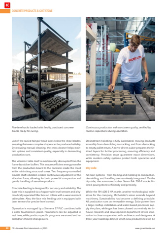 CONCRETE PRODUCTS & CAST STONE80 CPI %u2013 Concrete Plant International %u2013 6 | 2025 www.cpi-worldwide.comunder the raised tamper head and cleans the shoe blades, ensuring that even complex shapes can be produced reliably. By reducing manual cleaning, the cross cleaner helps maintain uptime and consistent quality, especially in demanding production runs.The vibration table itself is mechanically decoupled from the frame by rubber buffers. This ensures efficient energy transfer from the production board to the concrete inside the mold while minimizing structural stress. Two frequency-controlled double-shaft vibrators enable continuous adjustment of the vibration force, allowing for both powerful compaction and gentle handling of sensitive products.Concrete feeding is designed for accuracy and reliability. The base mix is supplied via a hopper with level sensors and a hydraulically operated filler box on rollers with a wear-resistant table plate. Also, the face mix feeding unit is equipped with laser sensors for precise level control. Operation is managed by a Siemens S7 PLC combined with a color touchscreen panel. Parameters can be adjusted in real time, while product-specific programs are stored and recalled for efficient changeovers. Downstream handling is fully automated, moving products smoothly from demolding to stacking and from destacking to empty pallet return. A servo-driven cuber prepares the finished layers for further processing, ensuring efficiency and consistency. Precision stops guarantee exact dimensions, while modern safety systems protect both operators and equipment.Dry sideAll main systems %u2013 from feeding and molding to compaction, demolding, and handling are seamlessly integrated. On the dry side, the automated cuber Servo Pak 700-2 stacks finished paving stones efficiently and precisely.While the RH 600-3 VA marks another technological milestone for the company, Micheletto%u2019s vision extends beyond machinery. Sustainability has become a defining principle. All production runs on renewable energy. Solar power from a large rooftop installation and water-based processes supply the plant, while gas has been phased out entirely. An inhouse research and development department drives innovation in close cooperation with architects and designers. A three-year roadmap defines which new product lines will be Five-level racks loaded with freshly produced concrete blocks ready for curing.Continuous production with consistent quality, verified by routine inspections during operation.