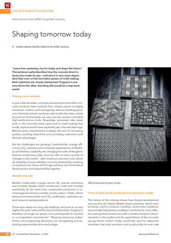 CONCRETE PRODUCTS & CAST STONE88 CPI %u2013 Concrete Plant International %u2013 6 | 2025 www.cpi-worldwide.com\This sentence aptly describes how the concrete block industry has made its way %u2013 and why it is now more dependent than ever on the innovative power of mold making. Both industries are closely intertwined: Progress in one area drives the other. Standing still would be a step backwards.Change as a constantIn just a few decades, concrete paving stones and other concrete products have evolved from simple pavers to highly functional, creative and ecologically relevant building products. Formerly simple machines and molds that were mainly focused on functionality are now precise, sensor-controlled high-performance tools. Nowadays, processes take place both in the concrete block plant and in mold making that hardly anyone would have expected just a few decades ago. Behind every improvement is always the aim of increasing quality, avoiding downtime and providing customers with decisive advantages.But the challenges are growing: Sustainability, energy efficiency, CO2 reduction and increased expectations of flexibility and delivery capability are changing the rules of the game. Anyone producing today must be able to react quickly to changes in the market %u2013 with maximum precision and, above all, reliability. Future viability is not only achieved by investing in machines, but above all through partners who think about development and responsibility together. Benefit and riskModern molds with a longer service life, precise machining and modular design reduce production costs and increase availability. At the same time, sustainable production is increasingly becoming a market access option: Public clients demand environmental and CO2 certificates, customers expect resource-saving products.Those who delay too long risk backlogs and have to accept higher life cycle costs and the loss of market share. Progress is therefore no longer an option, but a prerequisite for survival in a competitive environment. \means not postponing decisions, but recognising and exploiting opportunities at an early stage.From mobile block production to precision moldsThe history of the industry shows how closely development and success are linked. Mobile block machines, which were primarily used to produce building construction products, were initially followed by multilayer machines for more effective paving block production with a smaller footprint. Developments in the market and the expectations of the concrete paving block surface finally paved the way for stationary machines that took precision and productivity to ever new Shaping tomorrow todayKobra Formen GmbH, 08485 Lengenfeld, Germanyn Andreas Gebauer-G%u00fcnther, Kobra Formen GmbH, GermanyAM-produced tamper shoes