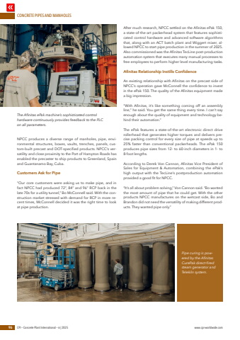CONCRETE PIPES AND MANHOLES96 CPI %u2013 Concrete Plant International %u2013 6 | 2025 www.cpi-worldwide.comNPCC produces a diverse range of manholes, pipe, environmental structures, boxes, vaults, trenches, panels, custom-built precast and DOT-specified products. NPCC%u2019s versatility and close proximity to the Port of Hampton Roads has enabled the precaster to ship products to Greenland, Spain and Guantanamo Bay, Cuba. Customers Ask for Pipe %u201cOur core customers were asking us to make pipe, and in fact NPCC had produced 72%u201d, 84%u201d and 96%u201d RCP back in the late 70s for a utility tunnel,%u201d Bo McConnell said. With the construction market stressed with demand for RCP in more recent times, McConnell decided it was the right time to look at pipe production.After much research, NPCC settled on the Afinitas ePak 150, a state-of-the-art packerhead system that features sophisticated control hardware and advanced software algorithms that, along with an ACT batch plant and Wiggert mixer, allowed NPCC to start pipe production in the summer of 2025. Also commissioned was the Afinitas TecLine post-production automation system that executes many manual processes to free employees to perform higher level manufacturing tasks.Afinitas Relationship Instills Confidence An existing relationship with Afinitas on the precast side of NPCC%u2019s operation gave McConnell the confidence to invest in the ePak 150. The quality of the Afinitas equipment made a big impression. %u201cWith Afinitas, it%u2019s like something coming off an assembly line,%u201d he said. You get the same thing every time. I can%u2019t say enough about the quality of equipment and technology behind their automation.%u201d The ePak features a state-of-the-art electronic direct drive rollerhead that generates higher torques and delivers precise packing control for every size of pipe at speeds up to 25% faster than conventional packerheads. The ePak 150 produces pipe sizes from 12- to 60-inch diameters in 1- to 8-foot lengths. According to Derek Von Cannon, Afinitas Vice President of Sales for Equipment & Automation, combining the ePak%u2019s high output with the TecLine%u2019s postproduction automation provided a good fit for NPCC. %u201cIt%u2019s all about problem solving,%u201d Von Cannon said. %u201cBo wanted the most amount of pipe that he could get. With the other products NPCC manufactures on the wetcast side, Bo and Brandon did not need the versatility of making different products. They wanted pipe only.%u201d The Afinitas ePak machine%u2019s sophisticated control hardware continuously provides feedback to the PLC on all parameters.Pipe curing is powered by the Afinitas CurePak direct-fired steam generator and Telekiln system.